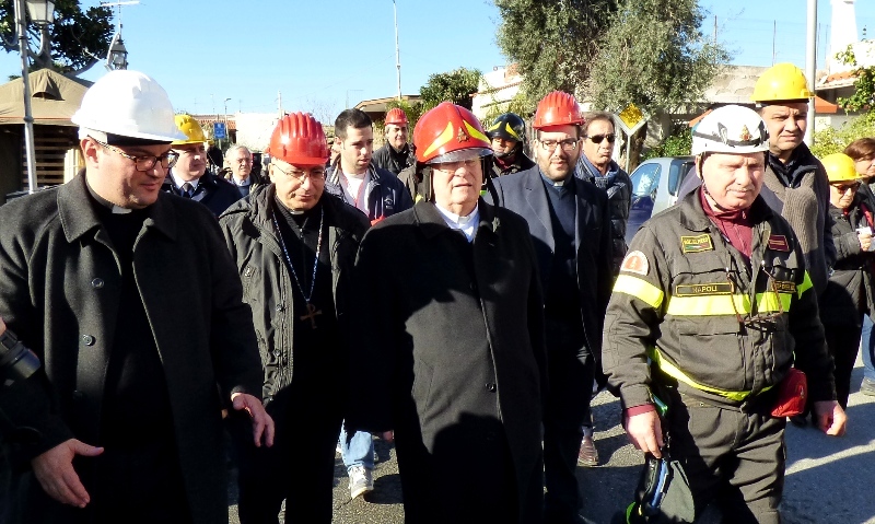 La prima tappa del Presidente della Cei, accompagnato dal Vescovo Lagnese, dai Sindaci e dai Parroci di Casamicciola e Lacco Ameno, è in piazza a Casamicciola nei locali dell’ex Capricho che il Comune sta utilizzando come sede provvisoria. Bassetti incoraggia tutti ad andare avanti e si complimenta per il lavoro fin qui svolto; un pensiero speciale alle forze dell’ordine e ai tanti che si sono impegnati senza risparmiarsi in quei drammatici frangenti. Ai giornalisti presenti dice: “grazie per la vostra opera: la stampa fa un lavoro importante perché subito ci ha dato l’occasione di vivere anche questo evento. A volte la gente si abitua a queste tragedie, ma una sana interpretazione dei fatti è più che positiva”. Subito dopo la visita al cuore pulsante della fede casamicciolese, la Basilica di Santa Maria Maddalena, anch’essa seriamente segnata dalla scossa del 21 agosto: all’esterno il parroco e i fedeli hanno voluto esporre l’immagine del Venerabile Parroco Giuseppe Morgera, (le cui spoglie riposano proprio nella Basilica dedicata alla Santa patrona), che tanto si adoperò per la ricostruzione umana e spirituale di Casamicciola dopo il devastante terremoto del 1883. A Piazza Maio, centro dell’evento tellurico di metà agosto, il card. Bassetti incontra prima un gruppo di persone che hanno deciso di continuare a ritrovarsi ogni giorno nel luogo dove sono nate e vissute fino a qualche mese fa e poi prosegue per una breve e intensa sosta davanti alle rovine della facciata della Chiesa dell’Addolorata, sotto le quali Lina Balestrieri ha perso la vita; poco distante da lì altre macerie, dal doppio volto, da queste è stato infatti estratto senza vita il corpo di Marilena Romanini e sono usciti sani e salvi i tre bambini simboli della speranza che continua a battere nel cuore di tutti. Prima della visita alla Chiesa di San Giuseppe al Fango c’è ancora tempo per esprimere qualche considerazione al termine di una due giorni decisamente intensa: “ho preferito venire ad Ischia in un periodo più distanziato dal sisma proprio perché le mie emozioni fossero più realistiche e mi sto rendendo conto che gli eventi vanno proporzionati a quello che è il territorio che li sta vivendo. Penso che da parte delle istituzioni, come già stanno facendo, e in prima linea la Chiesa locale con il Vescovo Pietro già presente dai primi attimi seguiti al sisma, ci vorrà un’attenzione particolare nella ricostruzione. Alla gente continuerei a ripetere la frase del Venerabile parroco Morgera che ho letto davanti alla Basilica di Santa Maria Maddalena: Casamicciola risorgerà! Casamicciola, le sue frazioni, Lacco Ameno, risorgeranno, ritorneranno ad essere quello che erano; non possiamo disperdere un patrimonio storico di tale bellezza”.