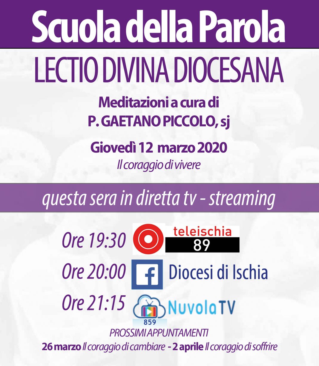Questa sera, giovedì 12 marzo, per il secondo appuntamento della Scuola della Parola, non potendosi svolgere in Cattedrale, abbiamo chiesto a P. Gaetano Piccolo sj di registrarci l’incontro: andrà in diretta alle 19:30 su Tele Ischia (canale 89), alle 20:00 su Facebook Diocesi di Ischia, alle 21:15 su Nuvola Tv (canale 859).
