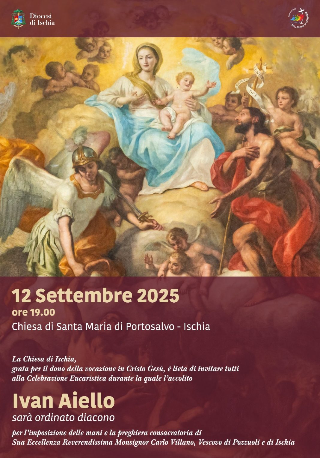 Diocesi ORDINAZIONE DIACONALE 25 Agosto 2025 Il 12 settembre, presso la chiesa di Santa Maria di Portosalvo, a Ischia, Ivan Aiello sarà ordinato diacono per l’imposizione delle mani e la preghiera consacratoria di Sua Eccellenza Mons. Carlo Villano, Vescovo di Pozzuoli e di Ischia. ARTICOLI CORRELATIALTRO DALL'AUTORE 22 agosto: digiuno e preghiera Nuovi avvicendamenti parrocchiali Disertiamo il silenzio: l’iniziativa per Gaza A settembre le Ordinazioni diaconali Il Vescovo Carlo invita al Pellegrinaggio giubilare del 25 ottobre 2025